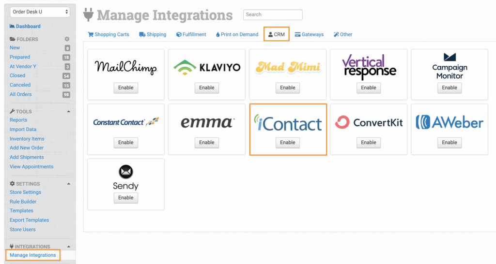 To enable the integration, click on Manage Integrations in the left sidebar. Under the CRM tab, find and enable the iContact integration.