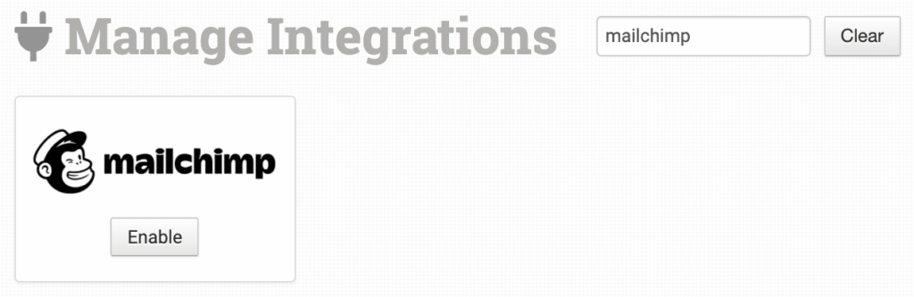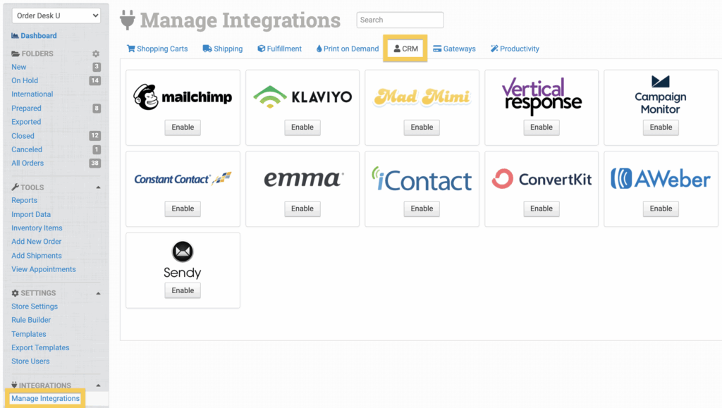 To enable the integration, click on Manage Integrations in the left sidebar. Under the CRM tab, find and enable the Mailchimp integration.