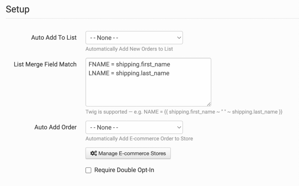 Use to automatically add new e-commerce orders to your Mailchimp E-commerce stores. If you’d like to choose the list dynamically or prefer to add your new orders with a rule, set this field to None.