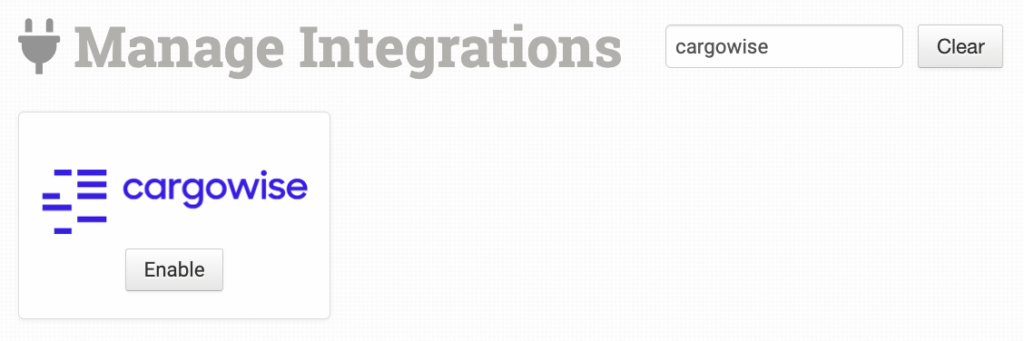 To enable the integration, click on the Manage Integrations link in the Integrations menu in the left sidebar. Under the Fulfillment tab, find and enable CargoWise.