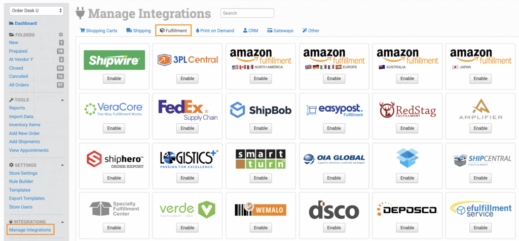 To connect to Clearnine, click on the Manage Integrations link in the left sidebar and under the Fulfillment tab find and enable the Clearnine integration.