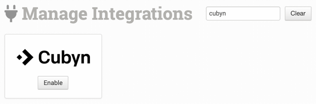 To connect to Cubyn, click on the Manage Integrations link in the left sidebar and under the Fulfillment tab find and enable the Cubyn integration.