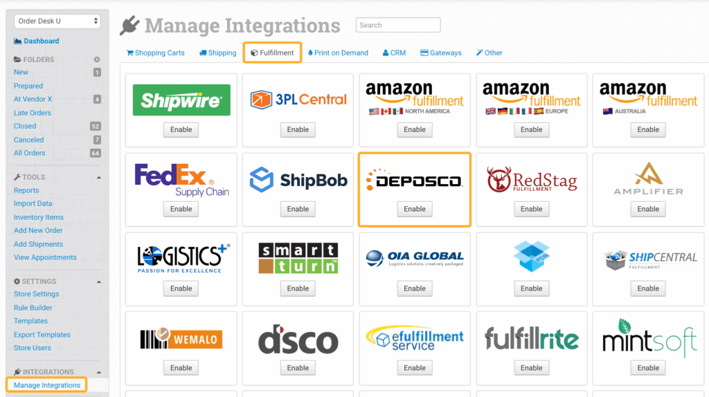 To connect your Deposco account to Order Desk, click on Manage Integrations under the Integrations menu in the left sidebar. Under the Fulfillment tab, find and enable Deposco.