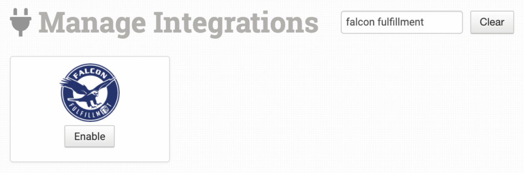 To enable the integration, click on the Manage Integrations link in the Integrations menu in the left sidebar. Under the Fulfillment tab, find and enable Falcon Fulfillment.