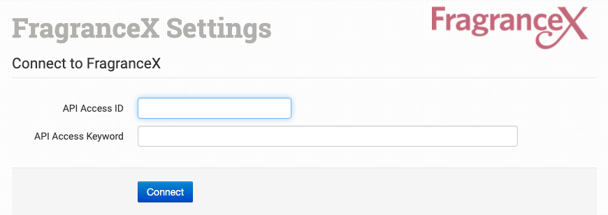 In the integration page, add your FragranceX API Access ID and Keyword and click to connect.