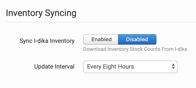 If Sync Inventory is enabled, select how often you want Order Desk to pull inventory counts in from I-dika.