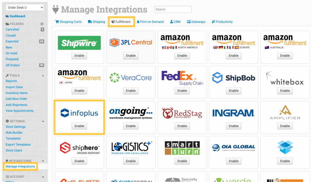 To enable the integration, click on the Manage Integrations link in the Integrations menu in the left sidebar. Under the Fulfillment tab, find and enable Infoplus.