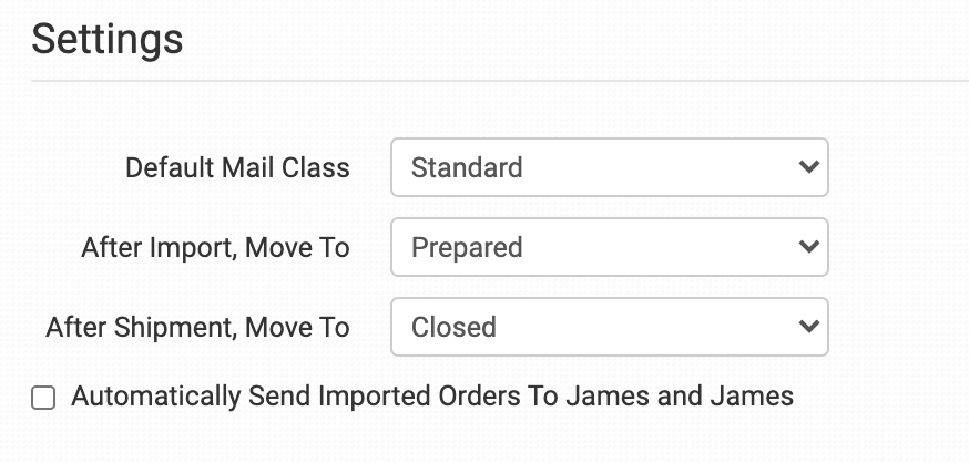 Select this setting only if all orders will be sent to James and James. If any orders will not be sent, or if you need a delay between when an order is imported into Order Desk and when it is sent do not select this and use the Rule Builder instead.