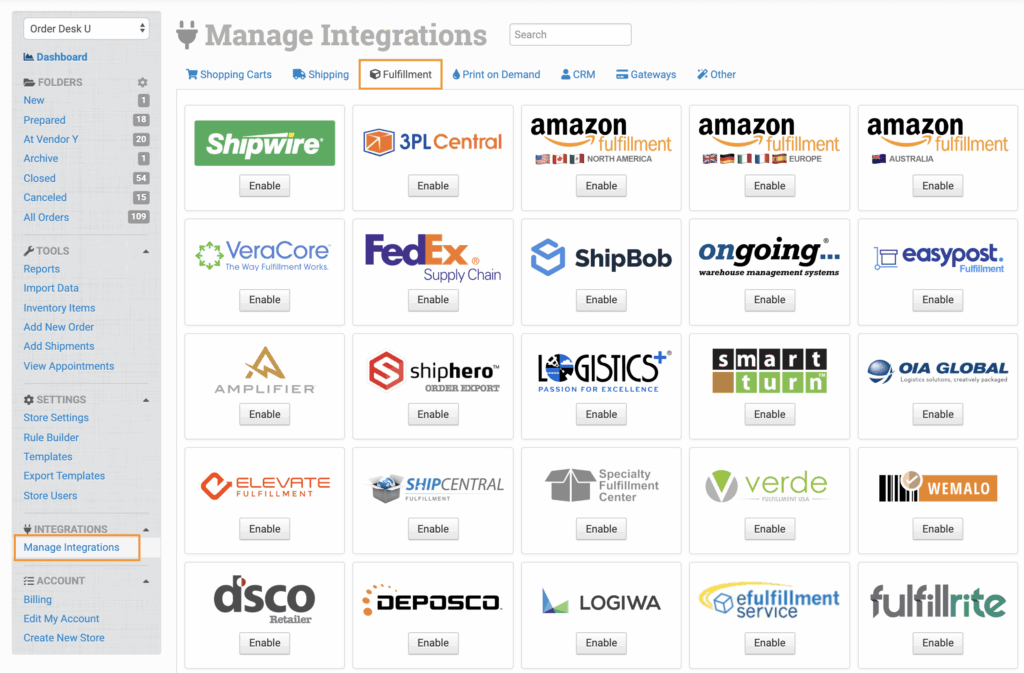 To connect to Logistech, click on the Manage Integrations link in the left sidebar and under the Fulfillment tab find and enable the Logistech integration.
