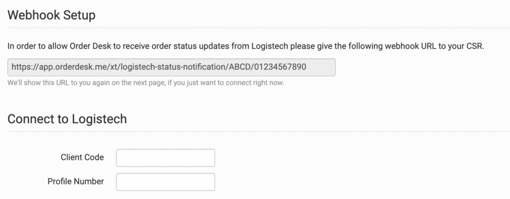 Give the provided webhook URL to your Logistech customer service representative so Order Desk can receive shipment information from Logistech. Enter your Logistech credentials to finish the connection.