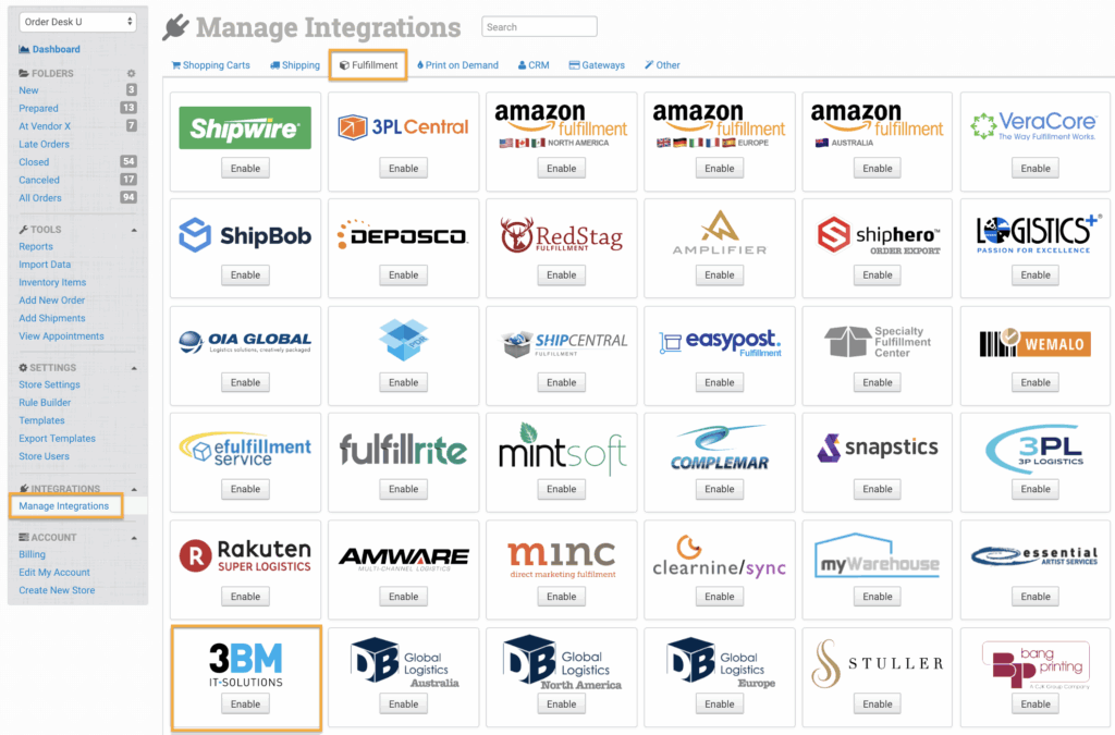 To connect the 3BM integration, click on the Manage Integrations link in the left sidebar and under the Fulfillment tab find and enable 3BM.