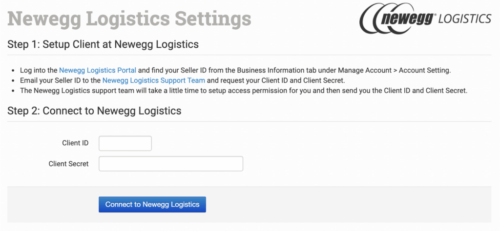 In the integration page, add your Newegg Logistics Client ID and Client Secret key. You will need to contact Newegg directly to request these details.
