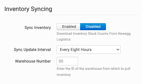 If Sync Inventory is enabled, select the interval you would like Order Desk to pull in inventory updates from Newegg Logistics.