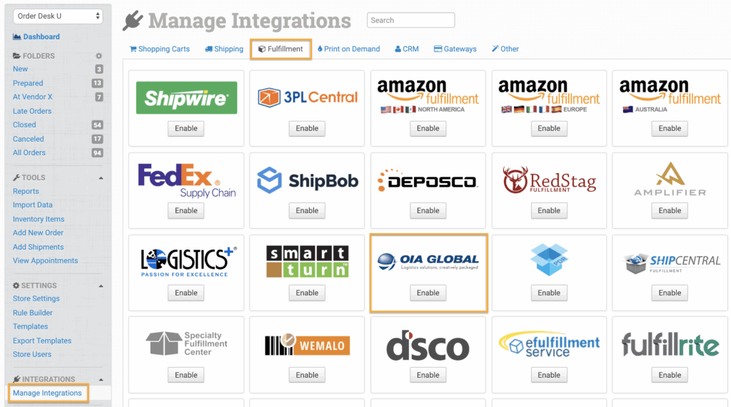 To connect to OIA Global, click on the Manage Integrations link in the left sidebar and under the Fulfillment tab find and enable the OIA Global integration.