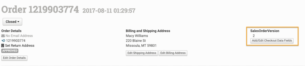 Then click on Add Checkout Data Fields in the upper right corner of the order page and add SalesOrderVersion with a value of 2 to the order.