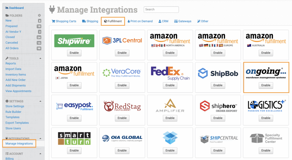 To connect to Ongoing WMS, click on the Manage Integrations link in the left sidebar and under the Fulfillment tab find and enable the Ongoing WMS integration.