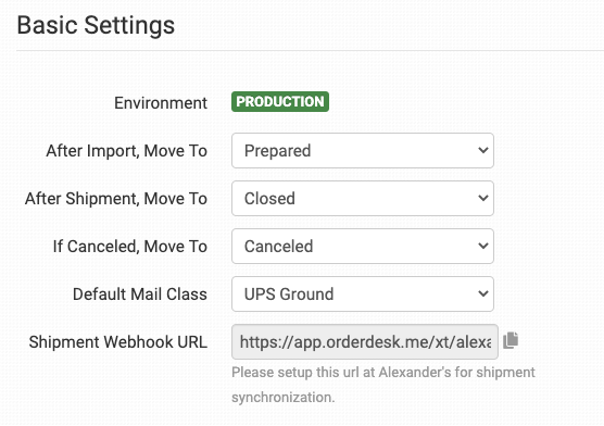 If you skipped this step when connecting the integration, add this webhook Notification URL to your Alexander’s account. This is necessary for Alexander’s to be able to send shipment notifications back into your orders in Order Desk.