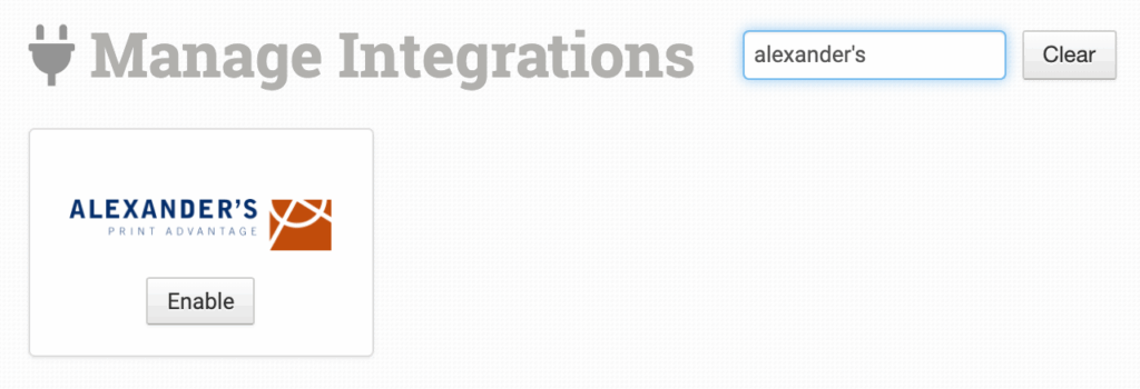 To connect to Alexander’s, click on the Manage Integrations link under the Integrations menu in the left sidebar, and under the Print on Demand tab find and enable Alexander’s.
