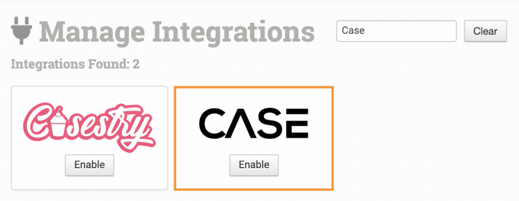 To connect to CASE, click on the Manage Integrations link under the Integrations menu in the left sidebar, and under the Print on Demand tab find and enable CASE.