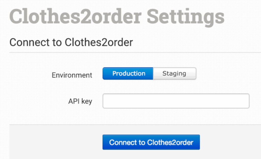 On the Clothes2order setup page, choose your environment, either Production (live) or Staging test), and enter the API Key provided to you by Clothes2order.