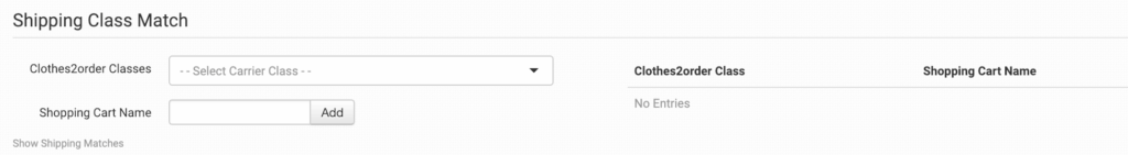 The shipping methods that you have set up in your shopping cart(s) may not match the methods that Clothes2order uses. To make sure your shipping preferences are sent through to Clothes2order with each order, match your methods to theirs in the shipping class match feature. If matches aren’t made, Clothes2order will use your default preferences set above.