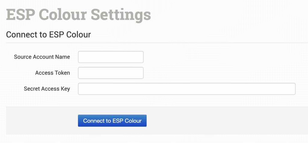 Your Source Account Name, Access Token, and Secret Access Key will all be provided by ESP Colour. Order Desk is unable to access this information for you.