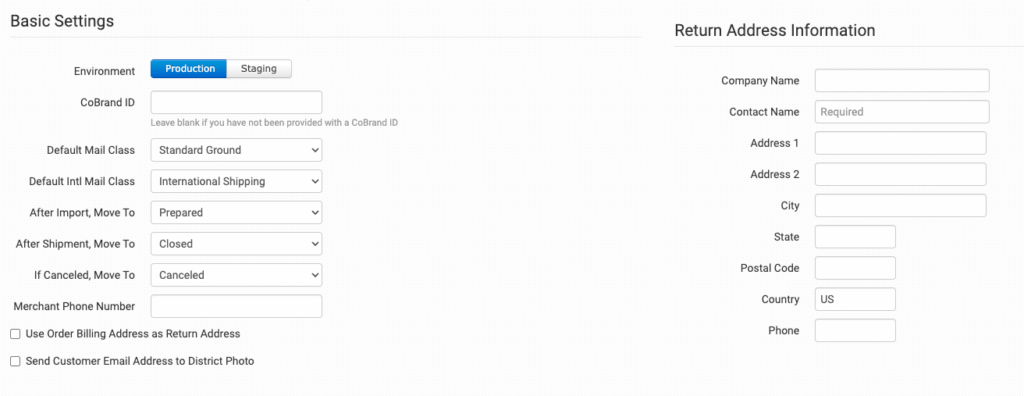While testing, keep this set to Staging. When ready to begin sending real orders to District Photo, switch this to Production.