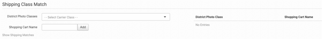 If you need District Photo to use a specific shipping method on an order by order basis rather than defaulting to the settings here, set your preferences in the Shipping Class Match section.