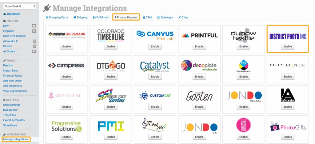 To connect to your District Photo account, click on Manage Integrations in the left sidebar. Under the Print on Demand tab, look for and enable the District Photo integration.