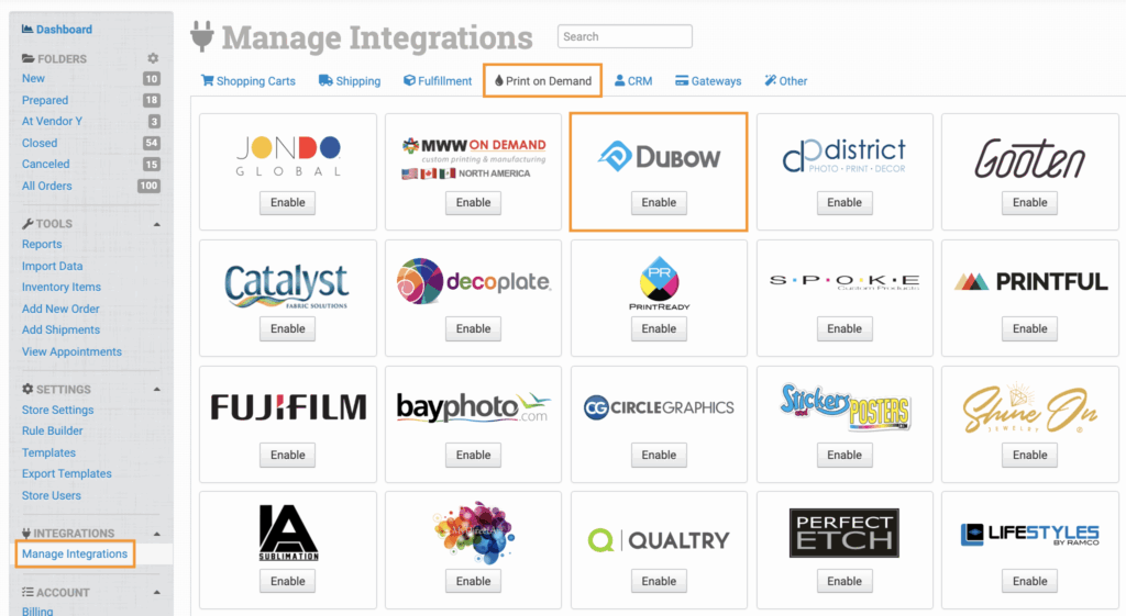 To connect to Dubow, click on the Manage Integrations under the Integrations menu in the left sidebar. Under the Print on Demand tab, find and enable Dubow.