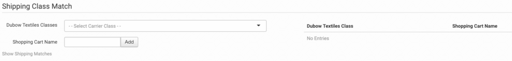 To set up more specific shipping options, you will need to match your method names to Dubow’s. This can be done in the shipping class match section.