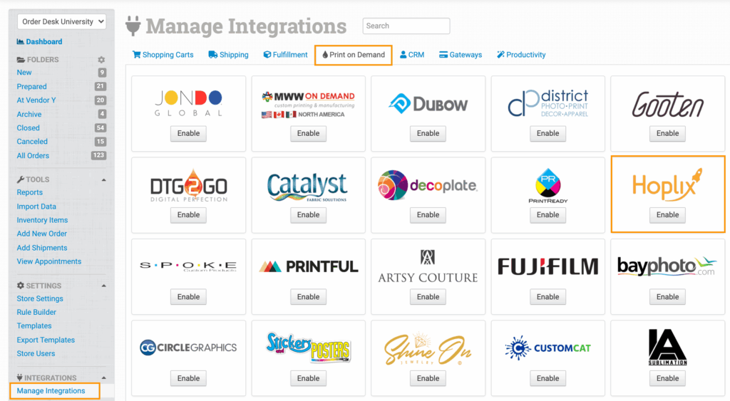 To connect to Hoplix, click on the Manage Integrations link under the Integrations menu in the left sidebar, and under the Print on Demand tab find and enable Hoplix.