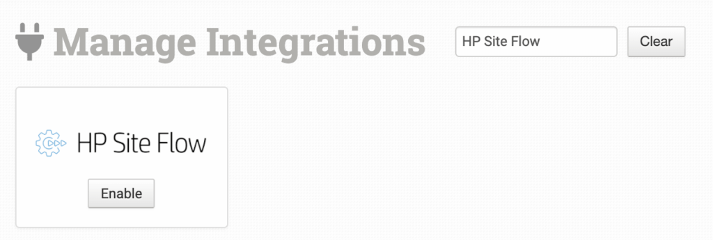 To connect to HP Site Flow, click on the Manage Integrations link in the left sidebar. Under the Print on Demand tab find and enable HP Site Flow.