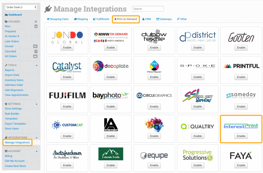 To connect to InterestPrint, click on the Manage Integrations link under the Integrations menu in the left sidebar, and under the Print on Demand tab find and enable InterestPrint.