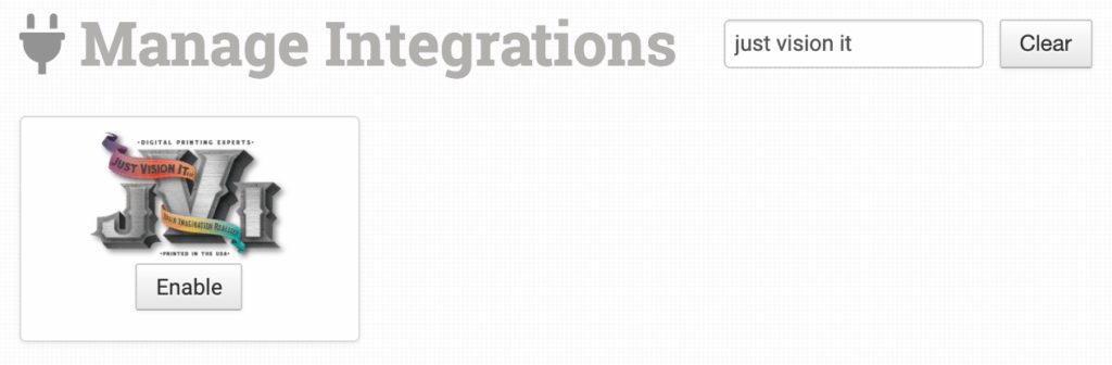 To enable the integration, click on Manage Integrations in the left sidebar. Under the Print on Demand tab, find and enable the Just Vision It integration.