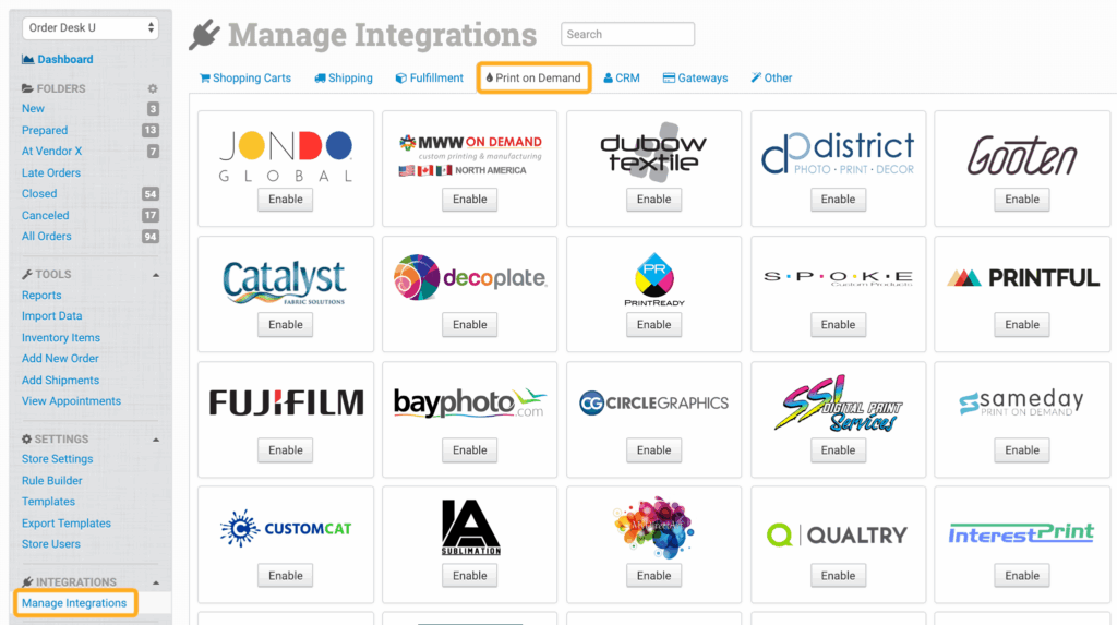 To connect to Kornit, click on the Manage Integrations link under the Integrations menu in the left sidebar, and under the Print on Demand tab find and enable Kornit.