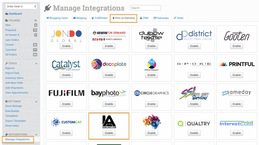 To connect to LA Sublimation, click on the Manage Integrations link under the Integrations menu in the left sidebar, and under the Print on Demand tab find and enable LA Sublimation.