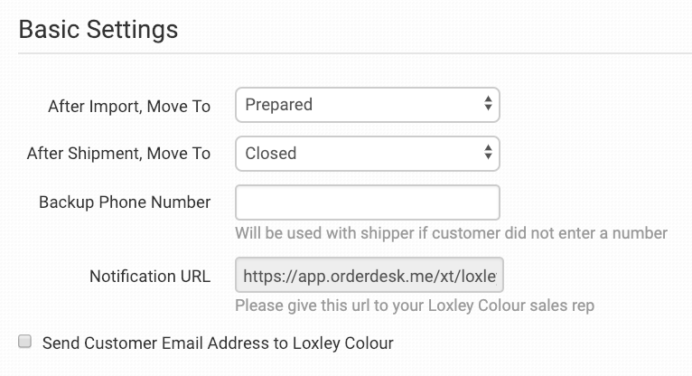 Give this notification URL to Loxley Colour. This is what connects them back to Order Desk so they can send shipment details automatically as they fulfill your orders.