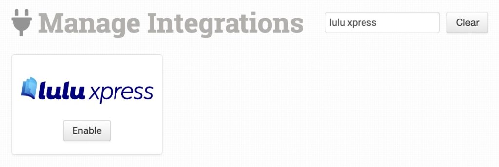 To connect to Lulu Xpress, click on Manage Integrations in the left sidebar. Under the Print on Demand tab, find and click to enable the Lulu Xpress integration.