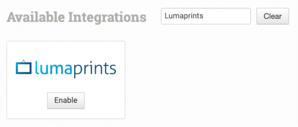 To connect to Lumaprints, click on Manage Integrations in the left sidebar. Under the Print on Demand tab, find and click to enable the Lumaprints integration.