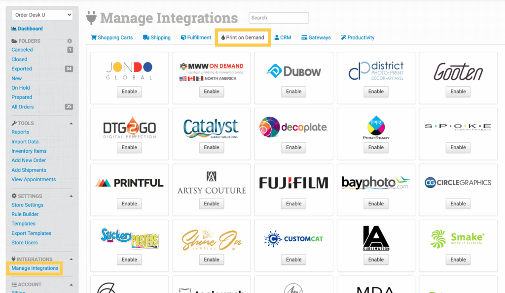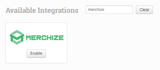 To enable the integration, click on Manage Integrations in the left sidebar. Under the Print on Demand tab, find and enable the Merchize integration.