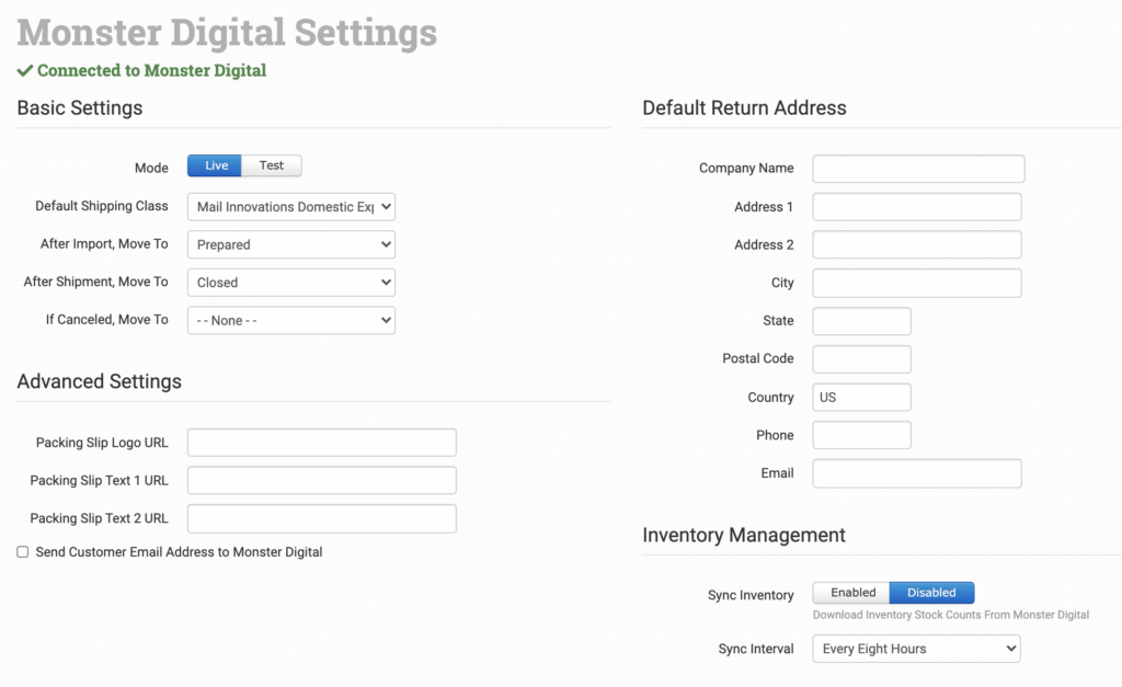 For more information on what the product settings within the Monster Digital integration do, please read the Print on Demand Product Settings guide.
