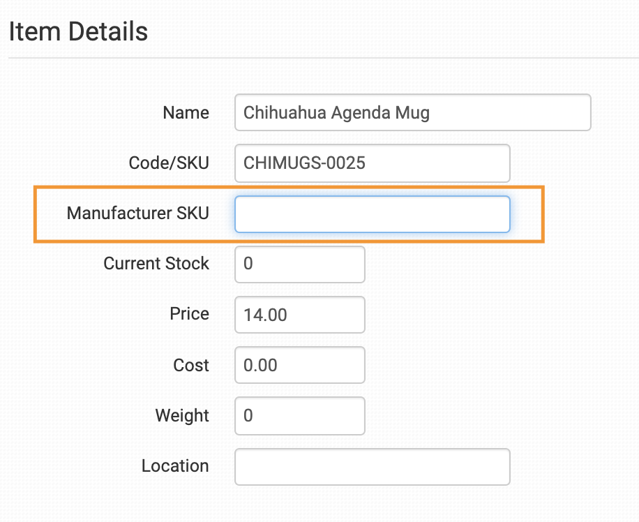 Because Monster Digital is a print on demand integration, the inventory updates will be based on the manufacturer SKU rather than your own item SKUs. When Monster Digital is enabled on your Order Desk store, you will see this Manufacturer SKU field on your inventory items, where you can set the Monster Digital SKU (the print_sku):