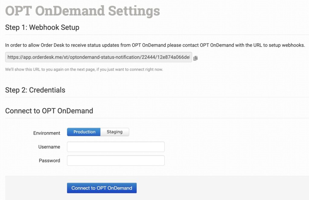 Once enabled, you’ll need to copy the webhook URL and contact OPT OnDemand directly so they can assist you with adding the URL to your account. Afterward, you’ll then need to select Production (live) or Staging (test) and enter the username and password that OPT OnDemand has provided for you and click to connect to the integration.