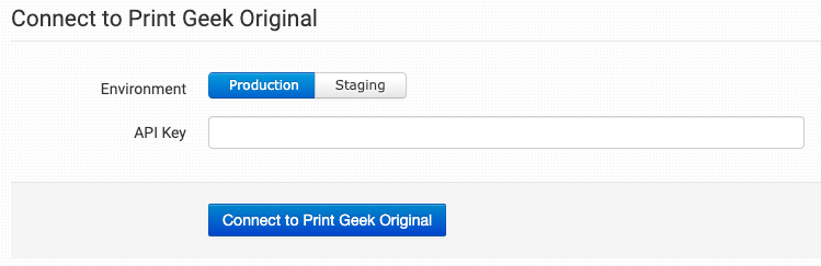 To connect to Order Desk, choose either the Production or Staging environment and enter your Print Geek Original API Key, then click to connect.
