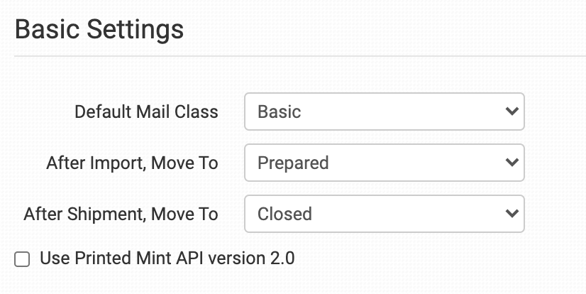 Enable this setting if Printed Mint has instructed you to do so. This will send your orders to Printed Mint via their new API. If you have any questions about this setting, please speak to Printed Mint directly for more information.