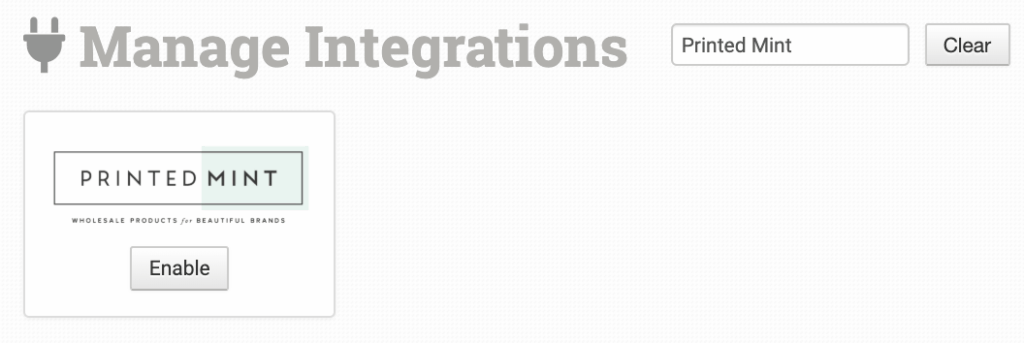 To connect to Printed Mint, click on the Manage Integrations link under the Integrations menu in the left sidebar, and under the Print on Demand tab find and enable Printed Mint.