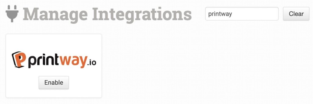 To connect to Printway, click on Manage Integrations in the left sidebar. Under the Print on Demand tab, find and click to enable the Printway integration.