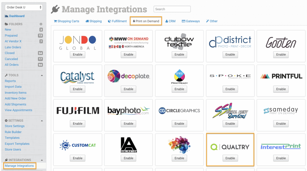Order Desk can submit your print on demand orders to Qualtry. As orders are fulfilled, the shipment info will automatically be pulled back into Order Desk and sent back to the original shopping cart.