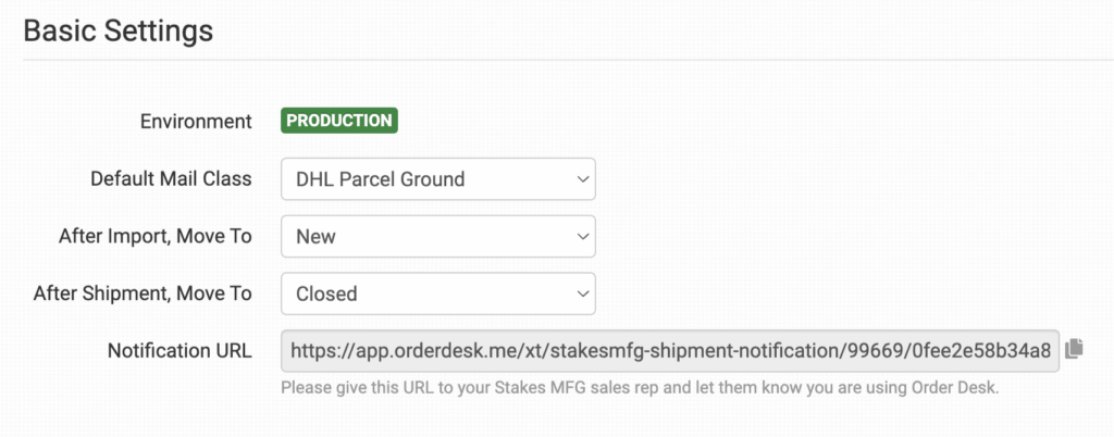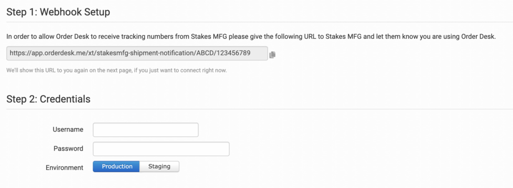 Once enabled, give the provided webhook URL to your Stakes MFG contact, and enter your Username and Password. Note that this is not the same as your user ID and email address. Choose your environment, either Production (live) or Staging (test).